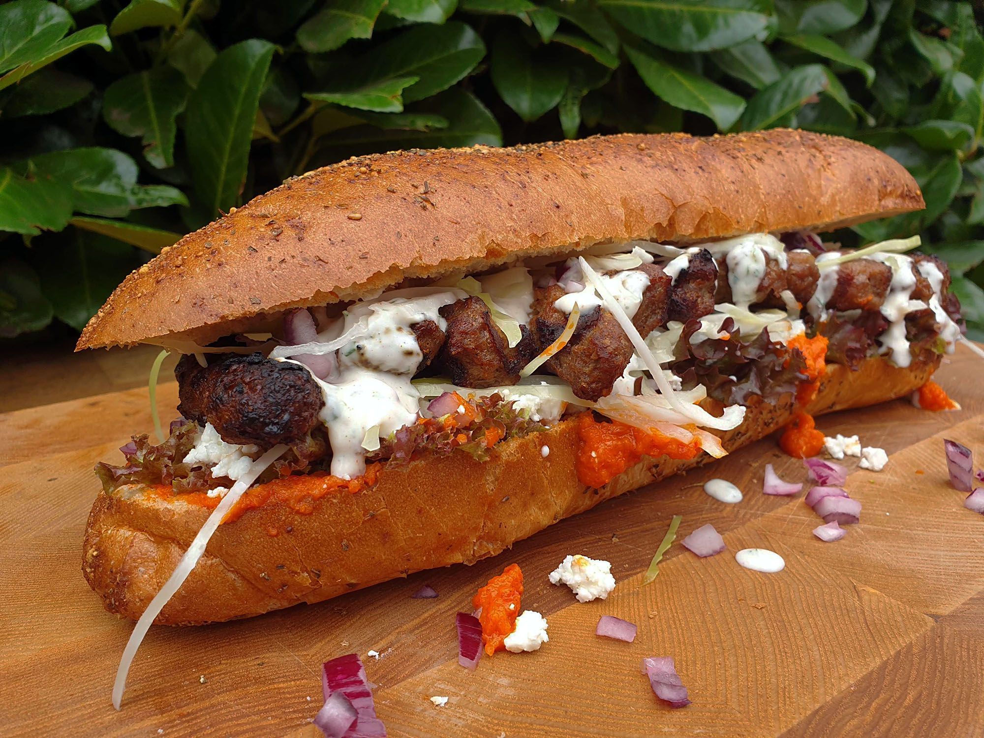 Unterseite Sandwich, Lollo Rosso, Ajvar, Cevapcici, Tzatziki, Zwiebeln, Krautsalat und zum Abschluss den Deckel drauf.