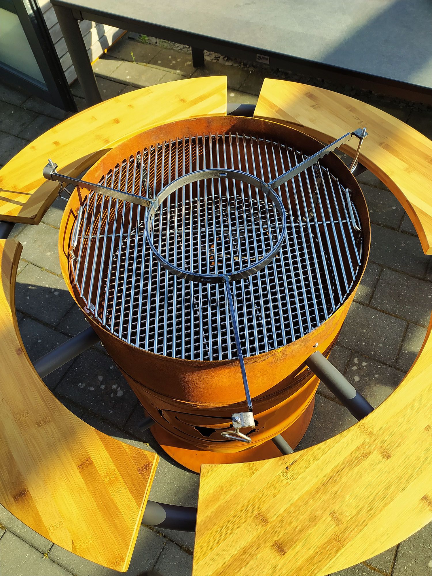 Die Materialien sind gut verarbeitet, das eingelassene Logo kommt gerade im Betriebszustand mit Feuer extrem gut zur Geltung. Was mich persönlich total begeistert, ist der umlaufende Ablagering mit vier Bambusbrettern, die die Optik weiter auflockern, und zudem extrem praktisch beim Betrieb der Feuertonne sind. So freue ich mich direkt nach dem Aufbau auf die ersten Grillexperimente an Moesta's Fireplace.