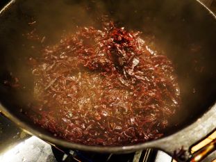 Im Dutch Oven das Butterschmals erhitzen und die Baconjam hineingeben. Zwiebelringe hinzufügen. Wenn sich das Fett aus der Baconjam löst, könnt Ihr die Rotkohlmischung dazugeben und alles für etwa 5-6 Minuten andünsten, bis es leicht weich wird.