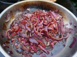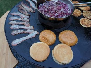 Wir haben unsere Cola-Zwiebel-Burger auf der Gussplatte unseres Moesta Bandit Fireplace zubereitet.