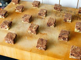 Wie Ihr auf den Fotos sehen könnt, kann man nicht nur bei den Toppings variieren, sondern auch beim Brownie Teig. Als wir die Fotos für dieses Rezept gemacht haben, haben wir die Hälfte des Brownie Teigs mit Schokolade und Backkakao zubereitet und beide Teige wie einen Marmorkuchen miteinander vermischt. Auch diese Variante schmeckt hervorragend.