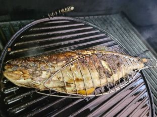 - Den Fisch mit etwas Olivenöl übergießen und in einen Fischhalter* klemmen. (Tipp: Da wir auch den Fischhalter großer Hitze aussetzen, macht es Sinn, dass kein Plastik am Fischhalter ist.) Wir hatten ein recht großes Exemplar, weshalb der Fischhalter etwas zu klein für unsere Forelle war. Nichts desto trotz hilft der Fischalter beim Wenden des Fisches. Dafür haben wir einen Grillhandschuh angezogen und mit einer Grillzange in der anderen Hand beim Wenden unterstützt.