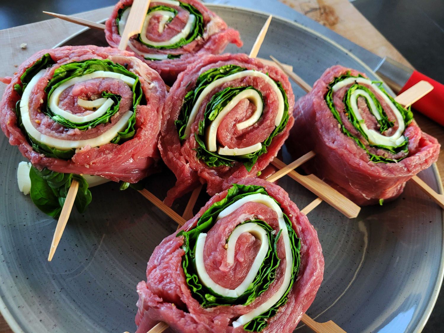 Die gefüllten Flanksteak Rollen werden Pinwheel, da sie in der aufgespießten Form optisch an ein, meist buntes, Kinder-Windrad (engl. = pinwheel) erinnern.