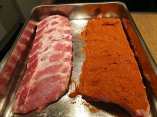 - Die Ribs werden nun gewürzt. Wir haben einen Magic Dust Rub und den Spare Rib Rub von Royal Spice genutzt. Die Ribs am besten einen Tag vorher würzen, anschließend in Frischhaltefolie eingepacken und über Nacht in den Kühlschrank legen.