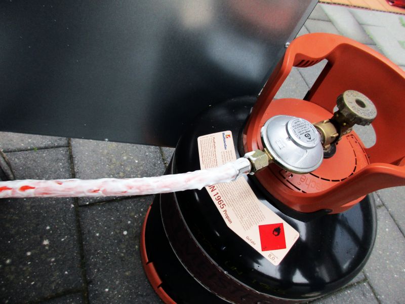 Natürlich sollte auch die Gaszufuhr gecheckt werden. Dafür mit einer Zange alle Schrauben auf einen festen Sitz überprüfen. Um auch den Gasschlauch auf seine Dichtigkeit zu überprüfen gibt es eine einfache Methode: nehmt handelsüblichen Rasierschaum und schmiert diesen an den Schlauch. Wenn sich im Schaum irgendwo Blasen bilden ist er undicht und sollte umgehend erneuert werden.